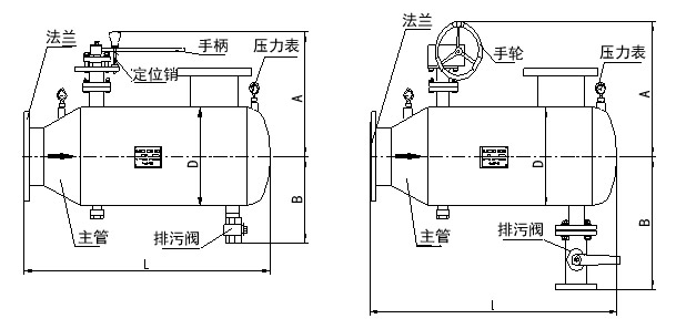 型號(hào) 公稱(chēng)通徑 最大流量 L(mm) A B D 排污口 重量Kg